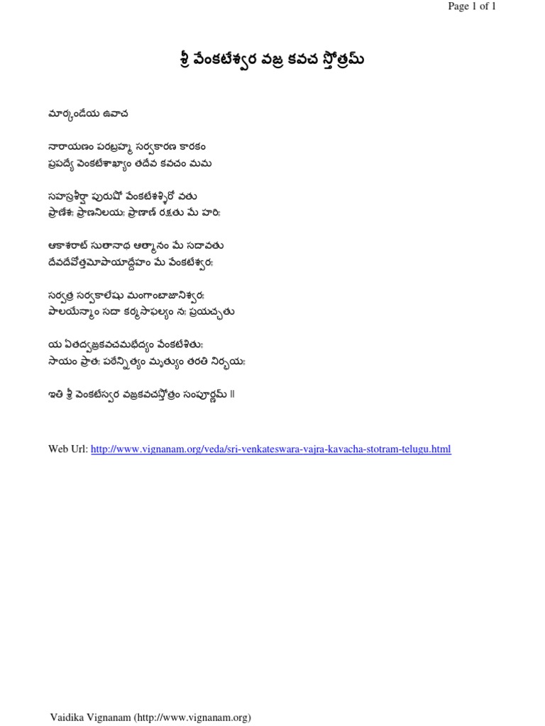 Web Sri Venkateswara Vajra Kavacha Stotram The Diamond armour of Lord Sri Venkateswara in telugu. A collection of spiritual and devotional literature in various Indian languages in Sanskrit Samskrutam. Temple Videos Free Devotional.
